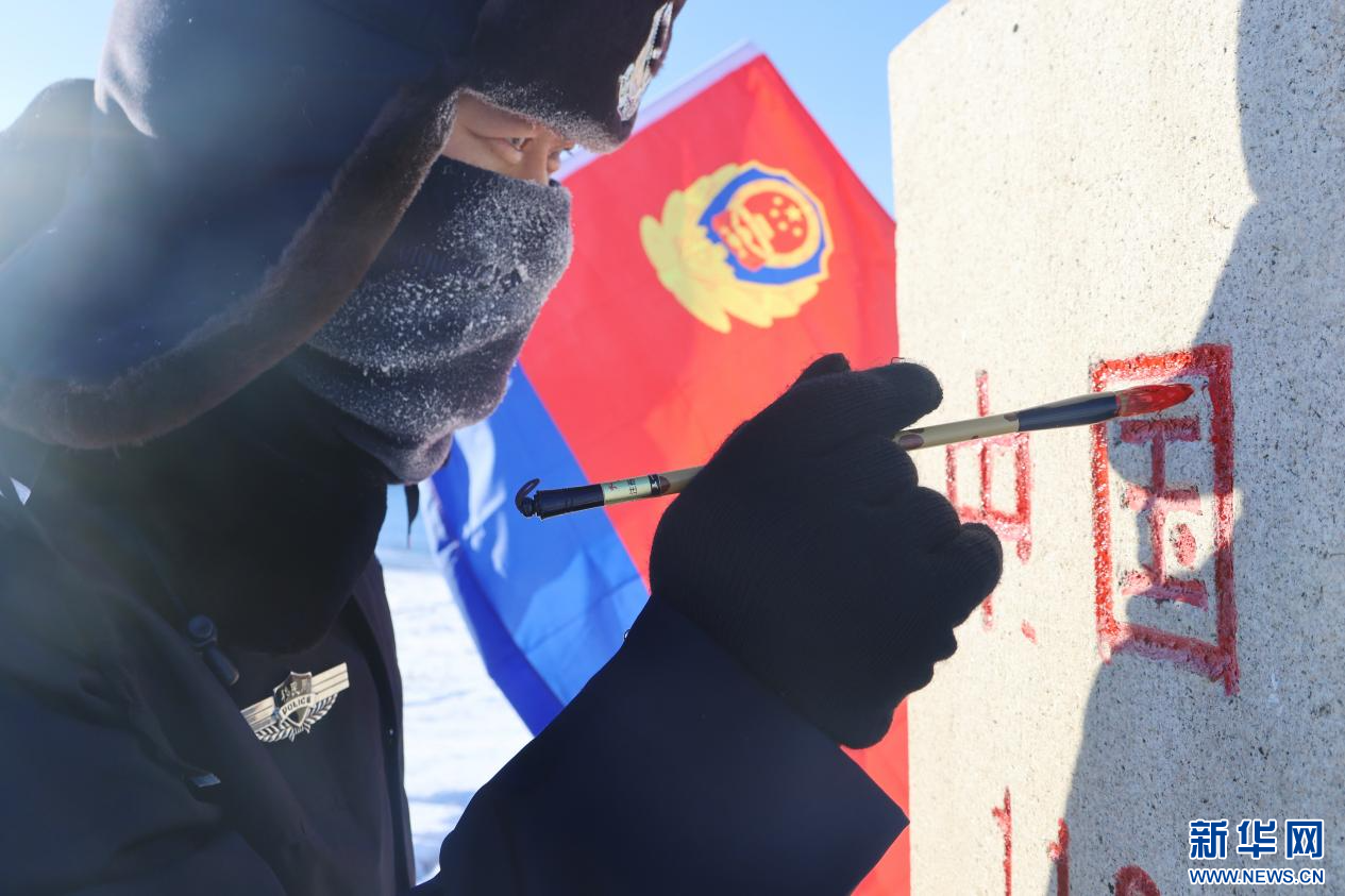 1月9日,驻守在中俄边境一线的呼伦贝尔边境管理支队黑山头边境派出所民警为界碑描红。新华网发 (李永健 摄)