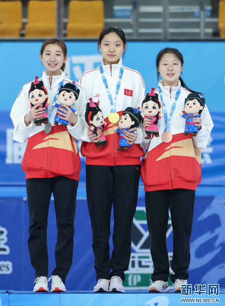 1月13日,冠军吉林队选手王晔(中)、亚军吉林队选手宋一霏(左)和季军吉林队选手宋佳蕊在颁奖仪式上合影。