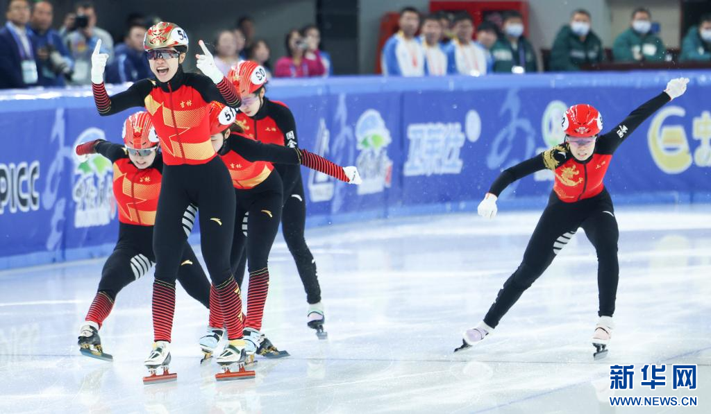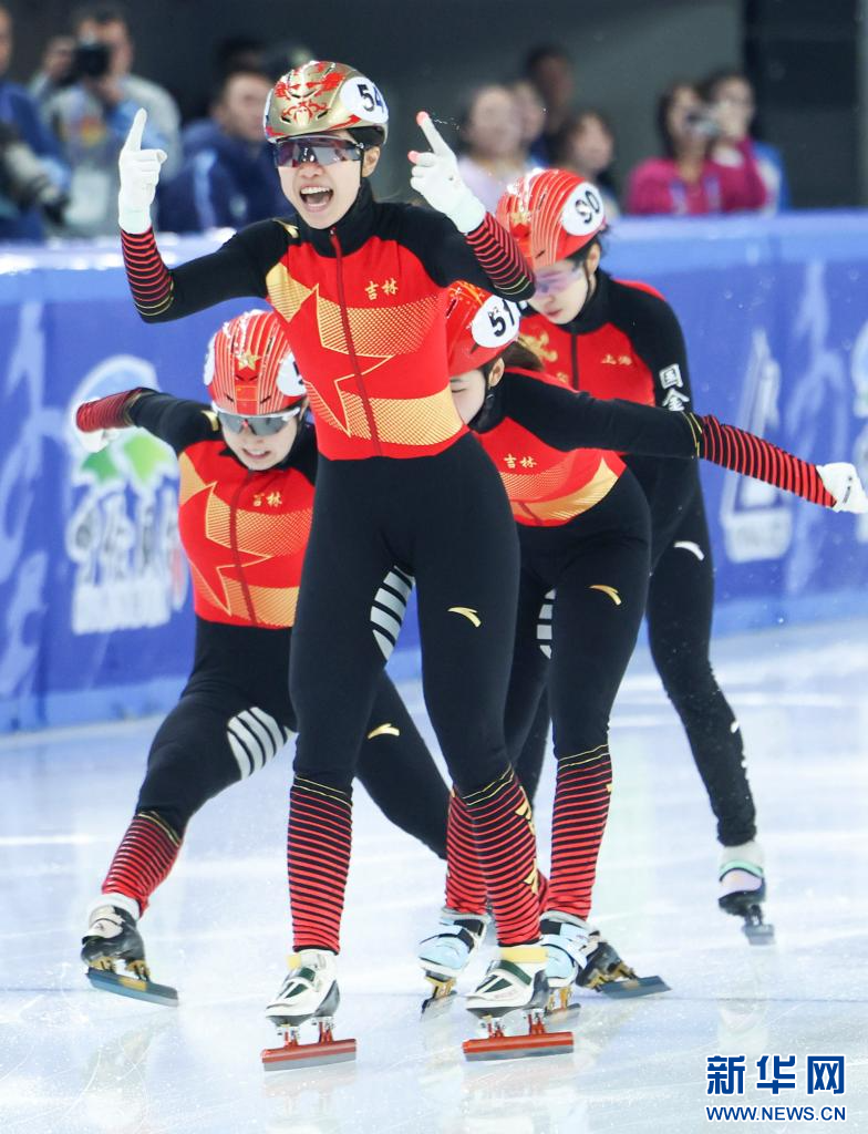 1月13日,吉林队选手王晔(左二)夺冠后庆祝。
