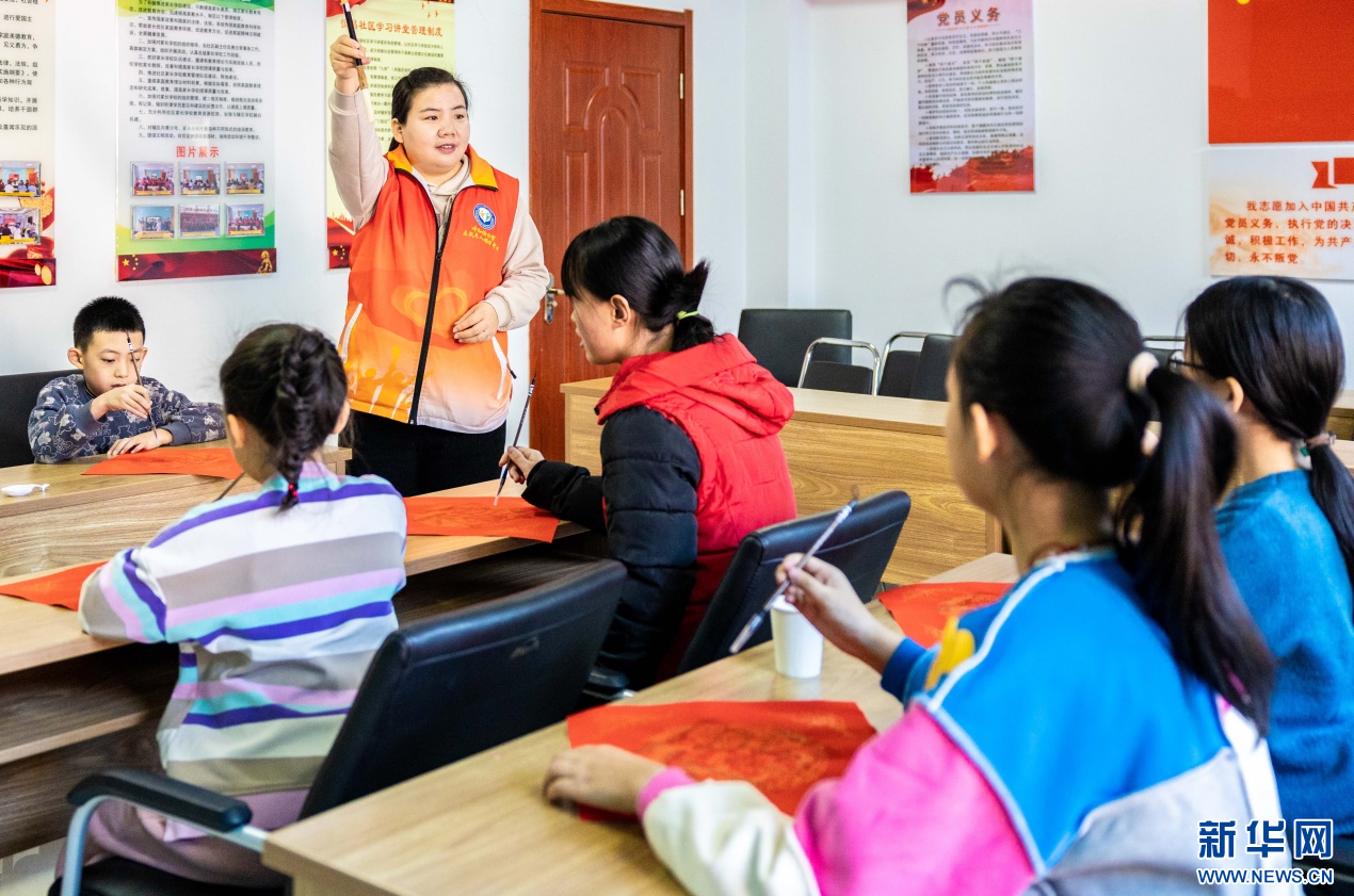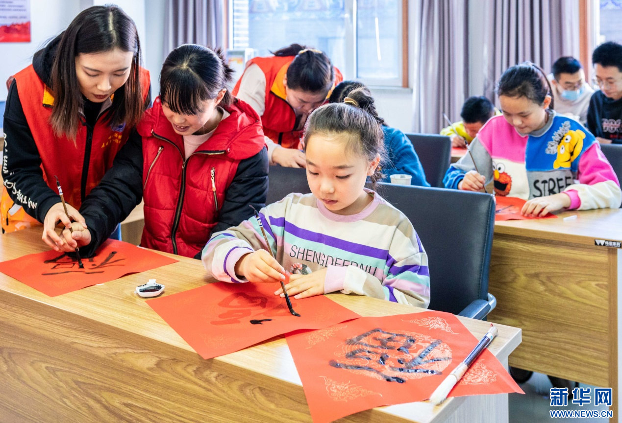 1月23日,志愿者在“品传统年韵 迎龙年新春”主题活动现场给孩子们讲授书写“福”字的要领。新华网发(丁根厚 摄)