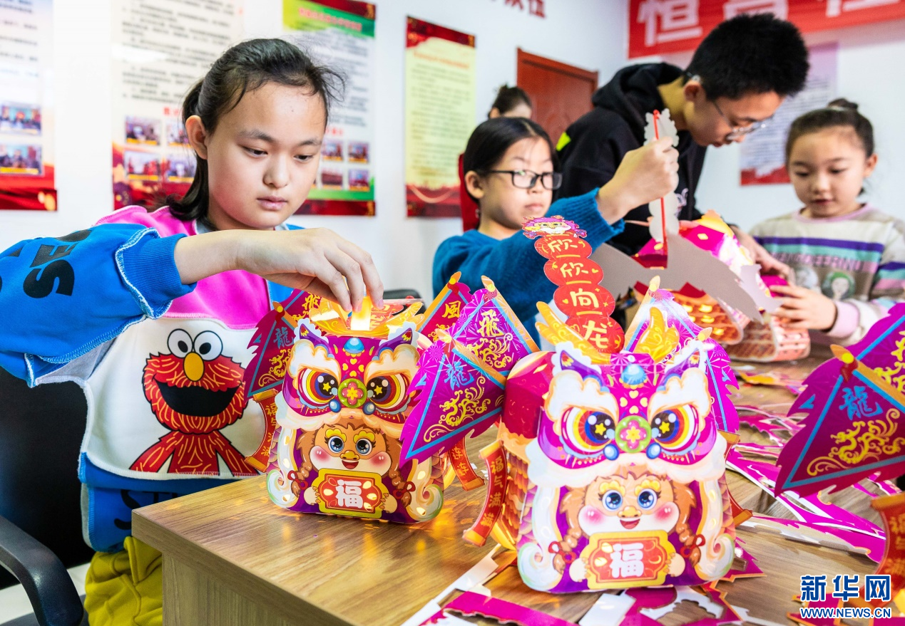 1月23日,孩子们在“品传统年韵 迎龙年新春”主题活动现场拼装龙年花灯。新华网发(丁根厚 摄)