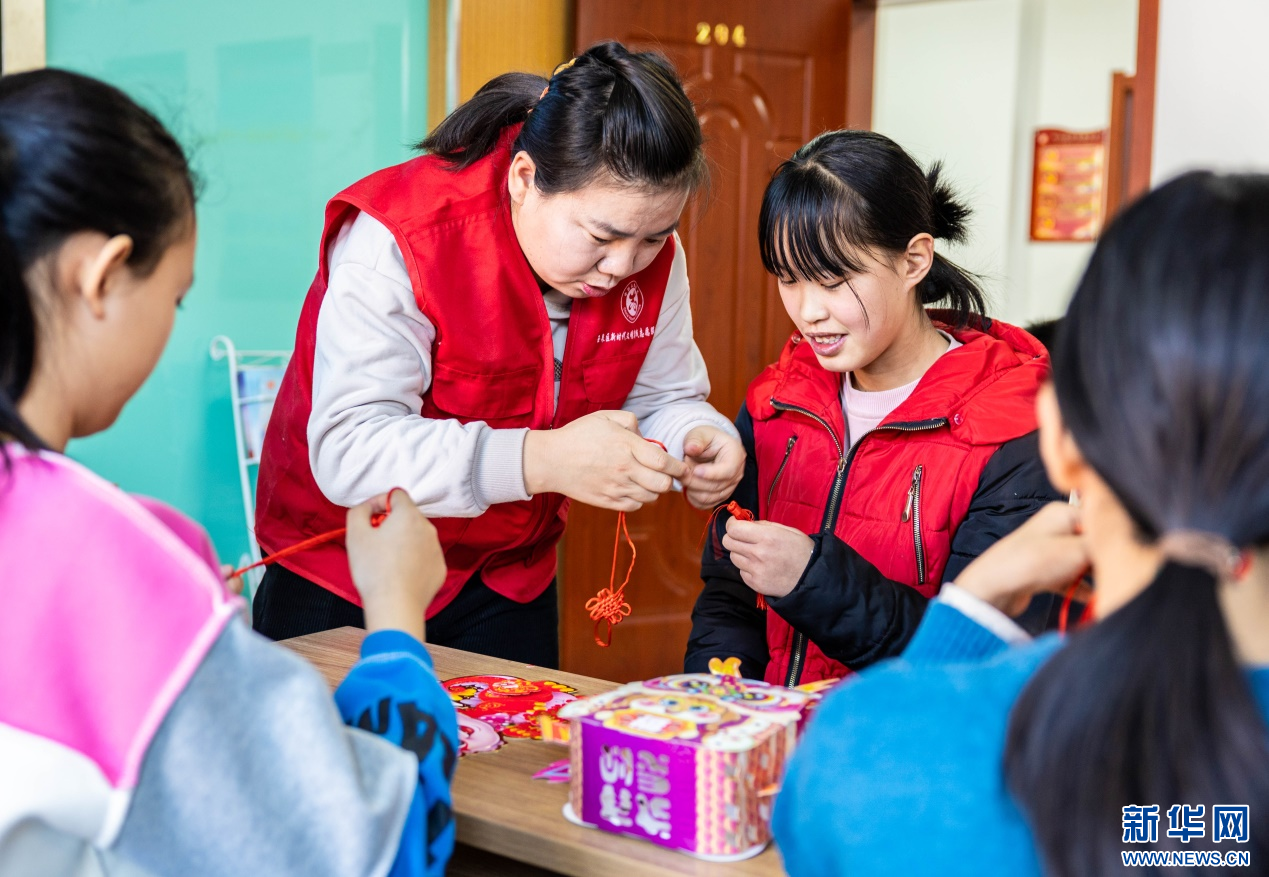1月23日,志愿者在“品传统年韵 迎龙年新春”主题活动现场给孩子们讲授中国结编织技艺。新华网发(丁根厚 摄)