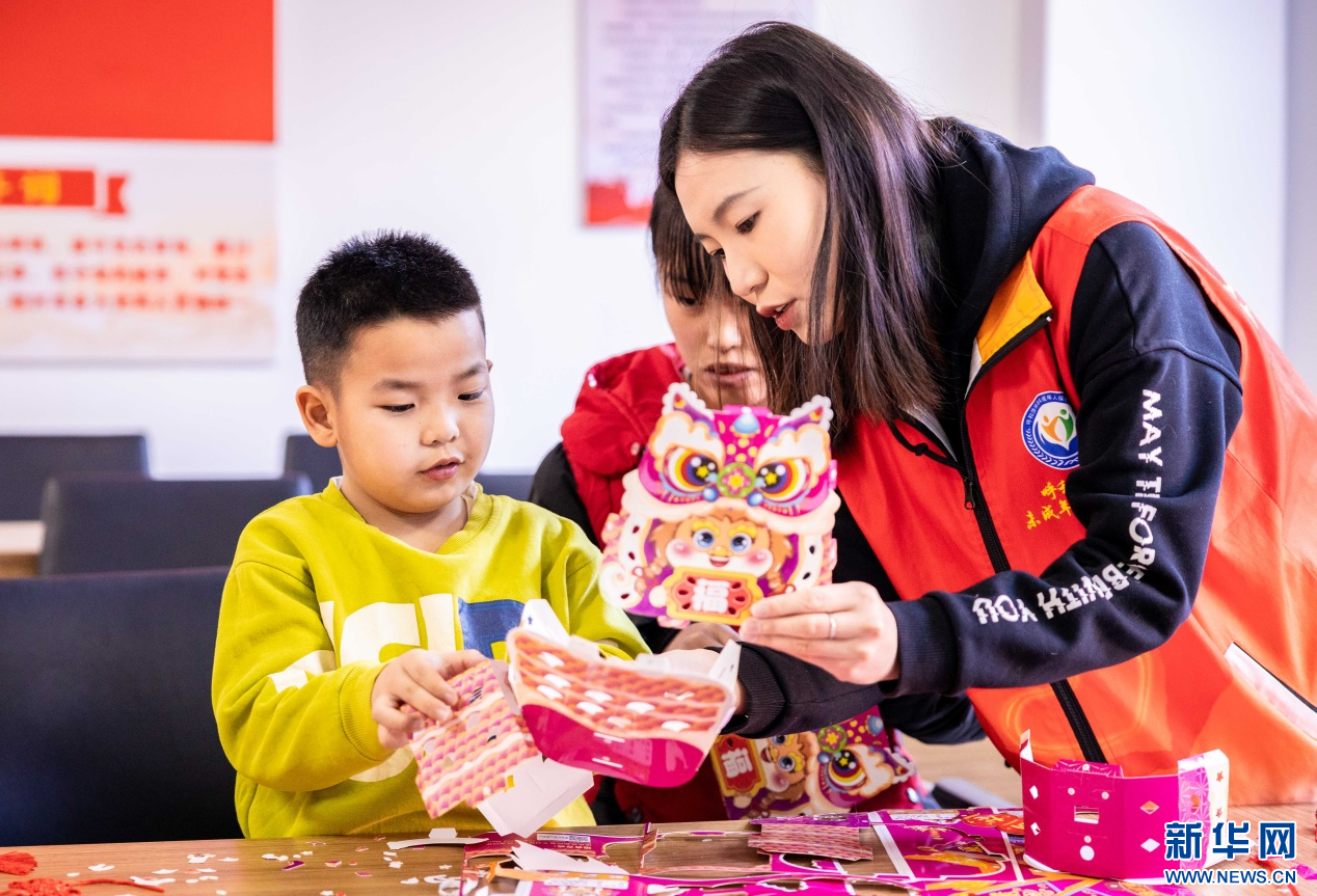 1月23日,志愿者在“品传统年韵 迎龙年新春”主题活动现场教孩子们拼装龙年花灯。新华网发(丁根厚 摄)