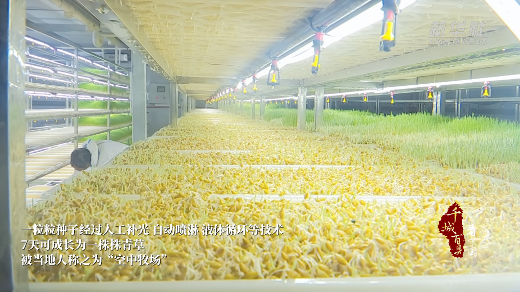 大棚内种植的牧草郁郁葱葱,绿意盎然,一派生机勃勃的景象。一粒粒种子经过人工补光、自动喷淋、液体循环等技术,7天可成长为一株株青草,被当地人称之为“空中牧场”。