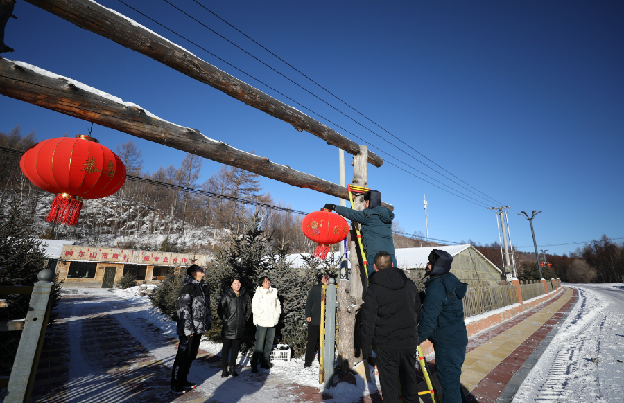 蒙东阿尔山供电公司白狼电工站电工杜春龙为居民点亮大红灯笼。
