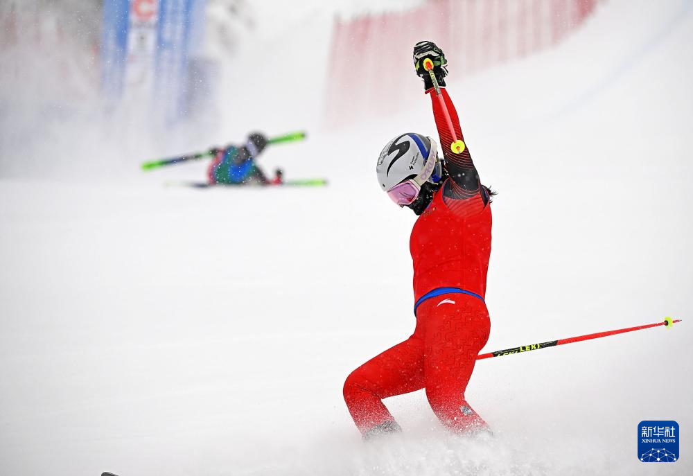 2月20日,黑龙江队选手张雪莲在冲过终点后庆祝。