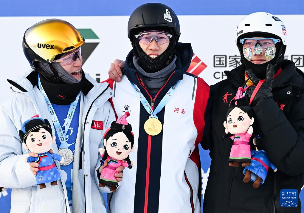 2月21日,冠军河南队选手陈硕(中)、亚军吉林队选手李天马(左)和季军黑龙江队选手方坤在自由式滑雪公开组男子空中技巧颁奖仪式上。