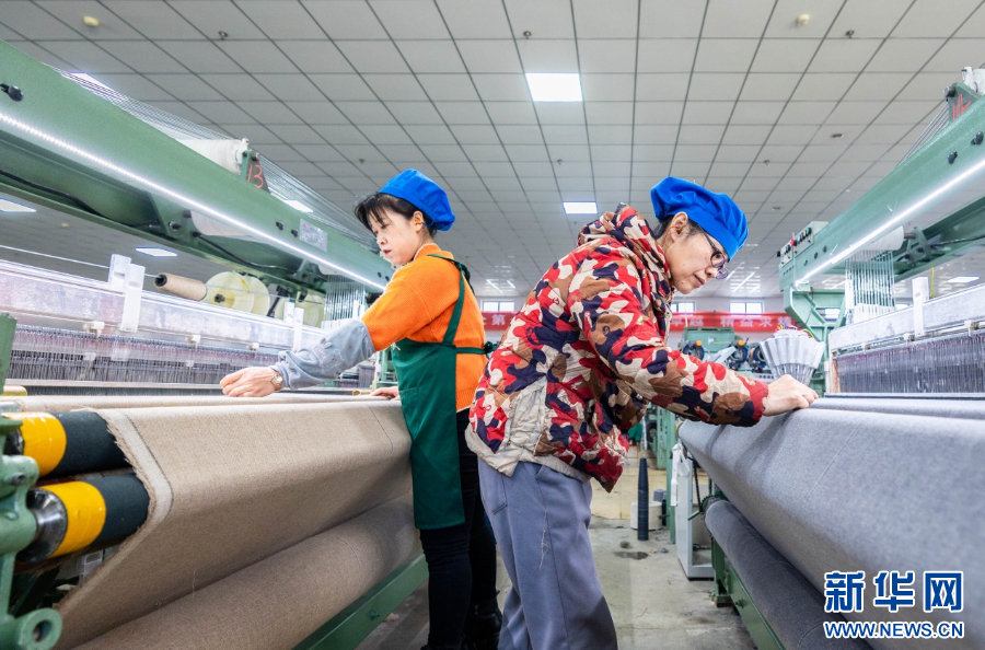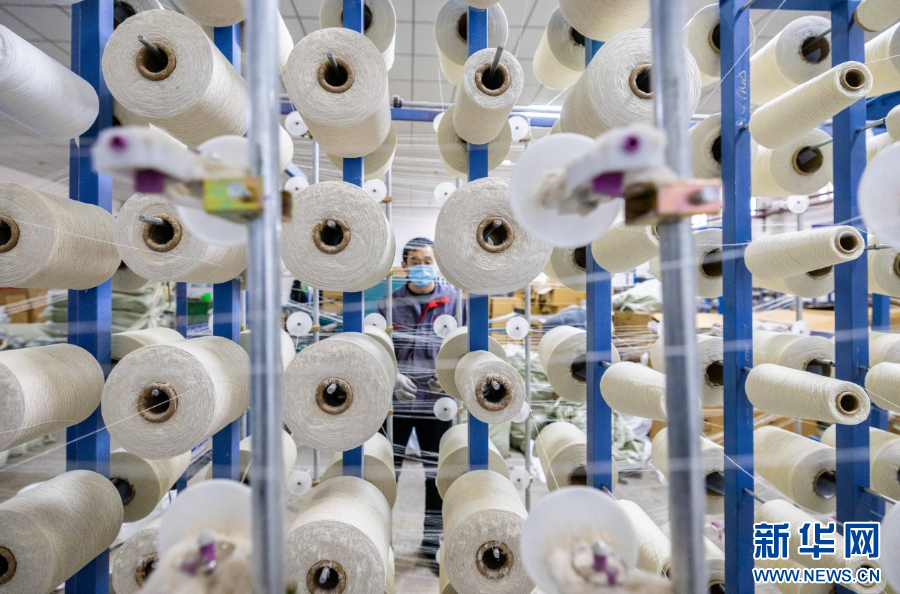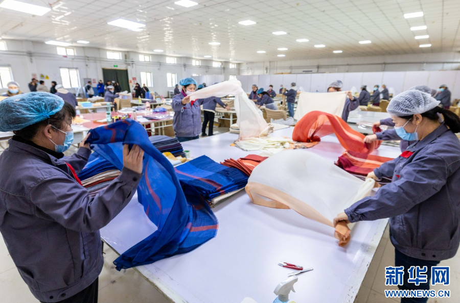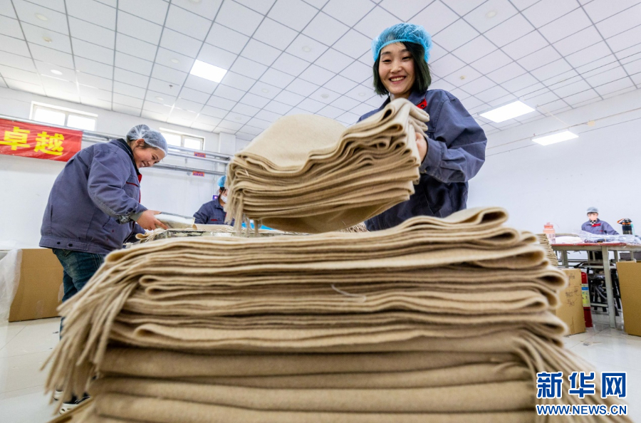 3月1日,在呼和浩特市玉泉区裕隆产业园区精卓羊绒制品有限公司生产车间,工人在赶制羊绒制品。新华网发(丁根厚 摄)