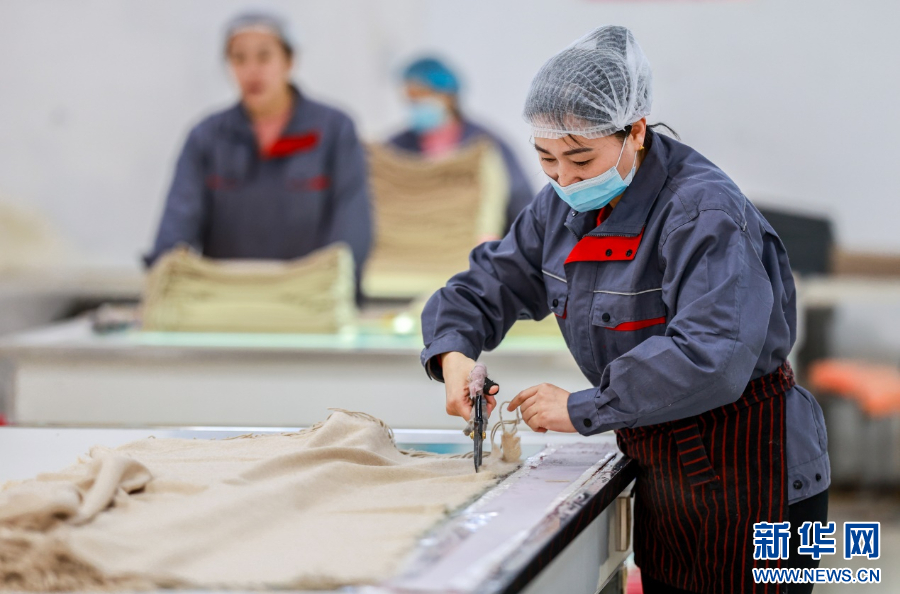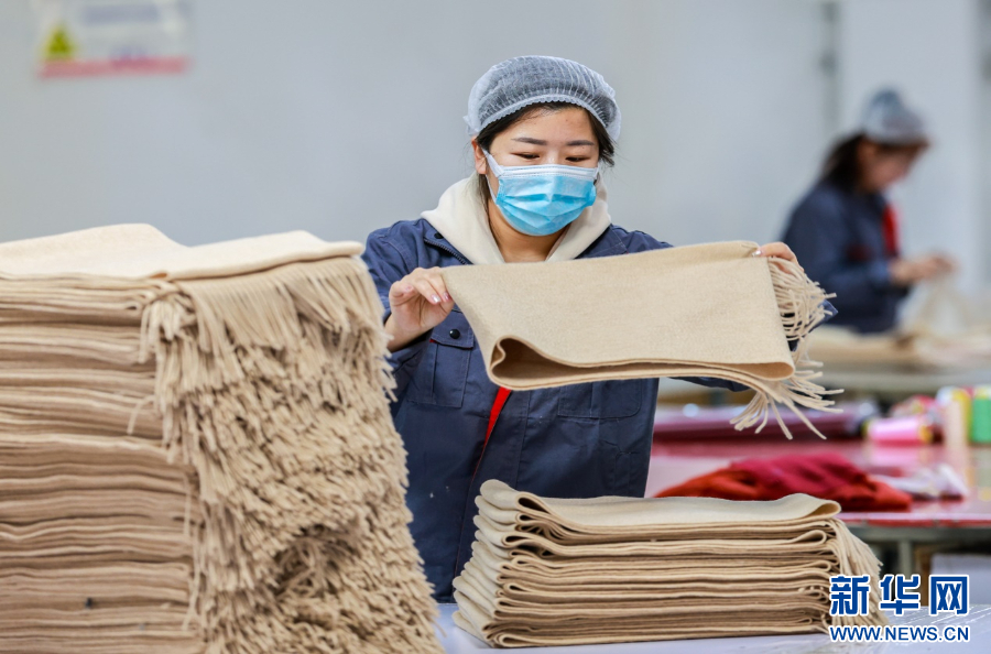3月1日,工人在赶制羊绒制品。新华网发(丁根厚 摄)
