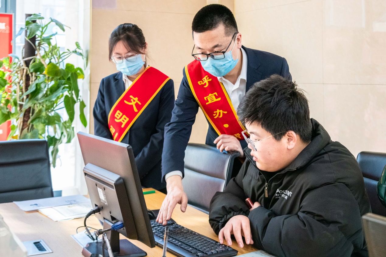 3月7日,工作人员在呼和浩特市玉泉区政务服务大厅“帮办代办服务台”协助市民进行网上申报。新华网发(丁根厚 摄)