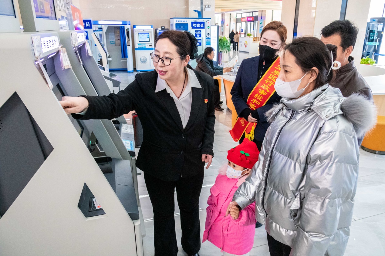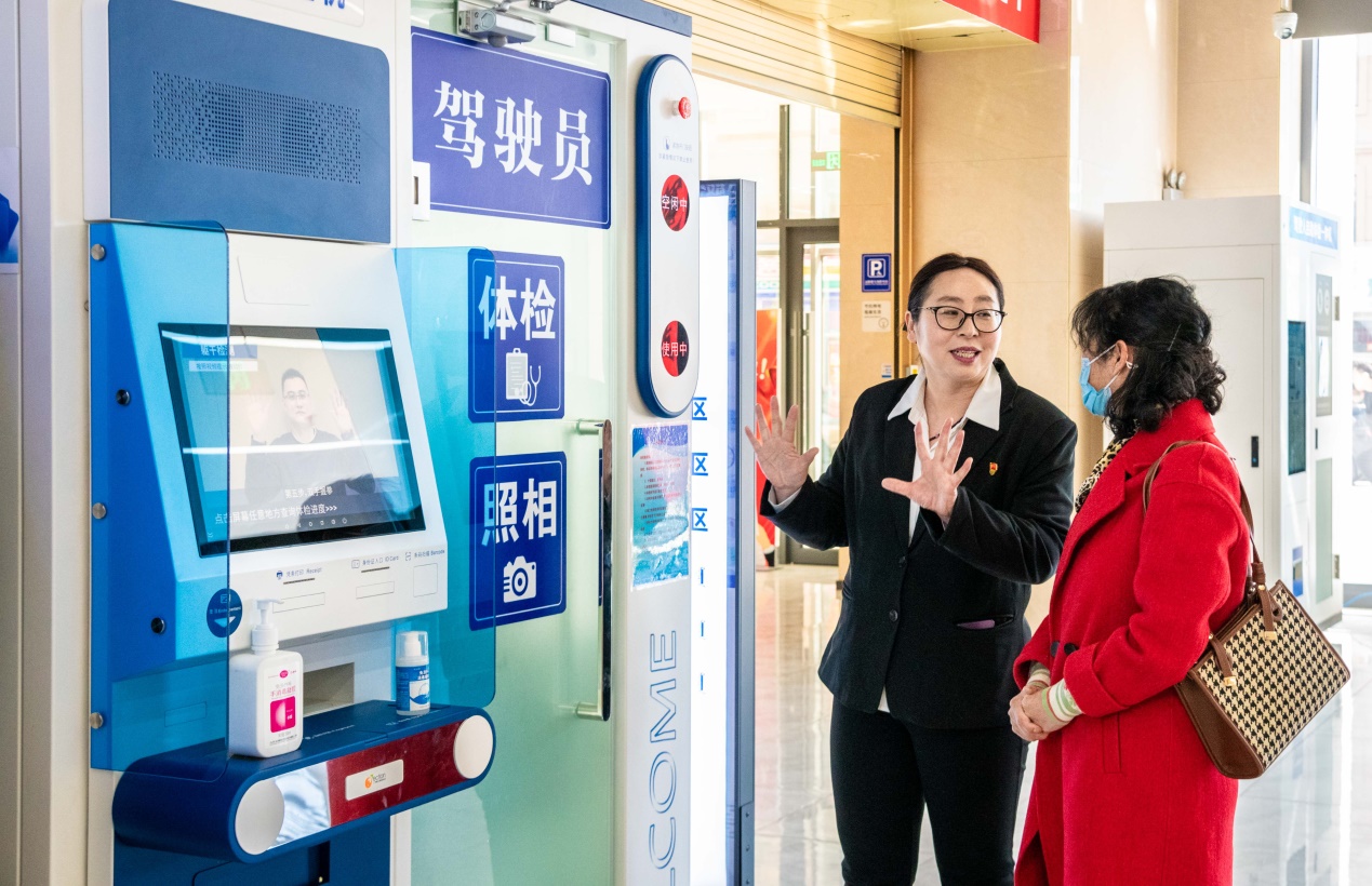 3月7日,工作人员在呼和浩特市玉泉区政务服务大厅“24小时政务服务自助超市”为办理驾驶证的市民答疑解惑。新华网发(丁根厚 摄)