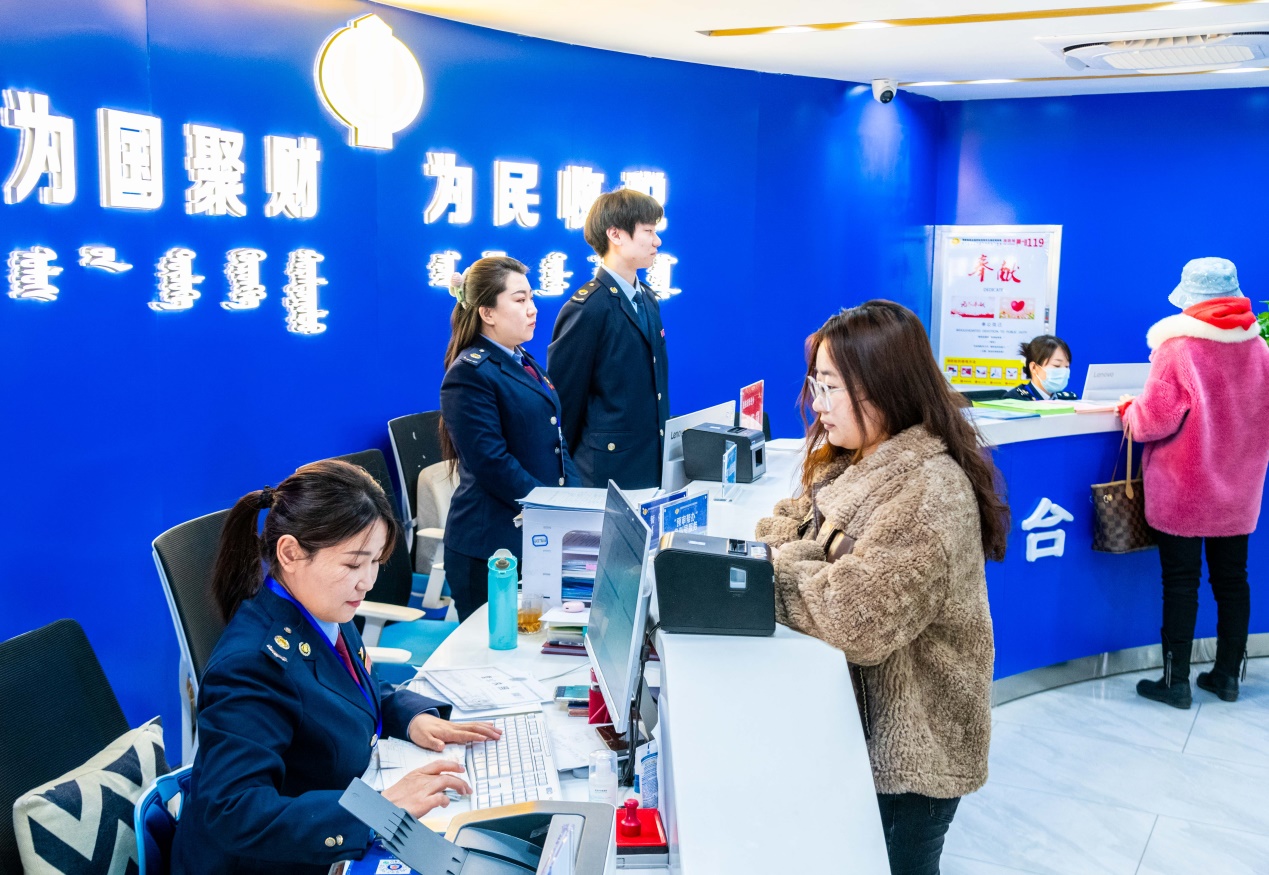3月7日,税务人员在呼和浩特市玉泉区政务服务大厅“帮办代办服务台”为企业人员办理涉税费业务。新华网发(丁根厚 摄)
