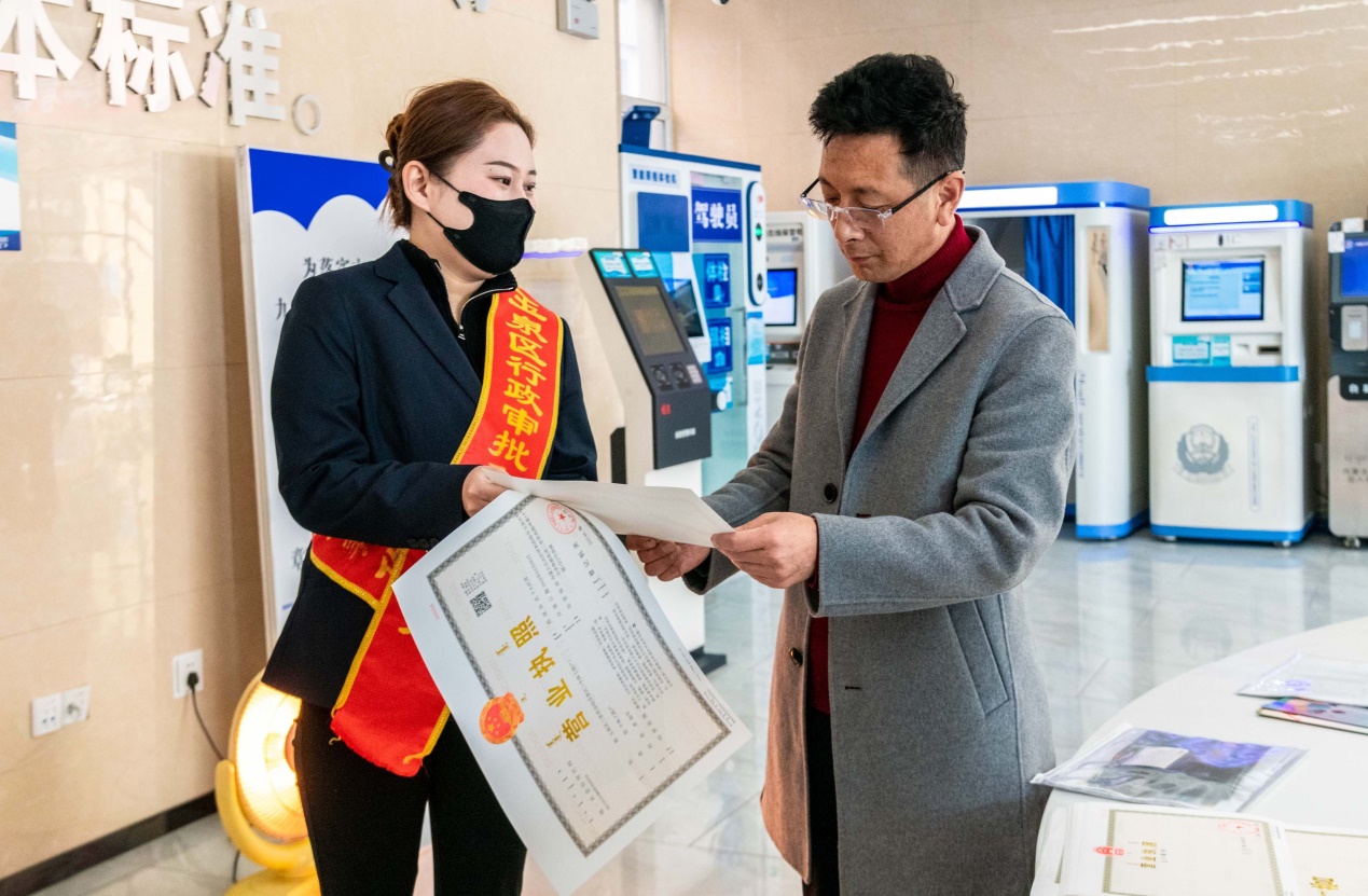 3月7日,个体经营户在呼和浩特市玉泉区政务服务大厅“24小时政务服务自助超市”领取营业执照。新华网发(丁根厚 摄)