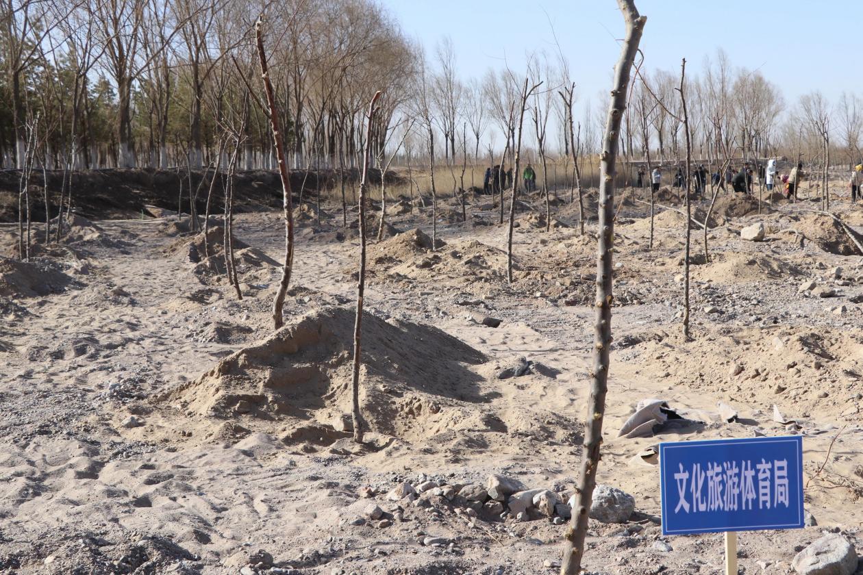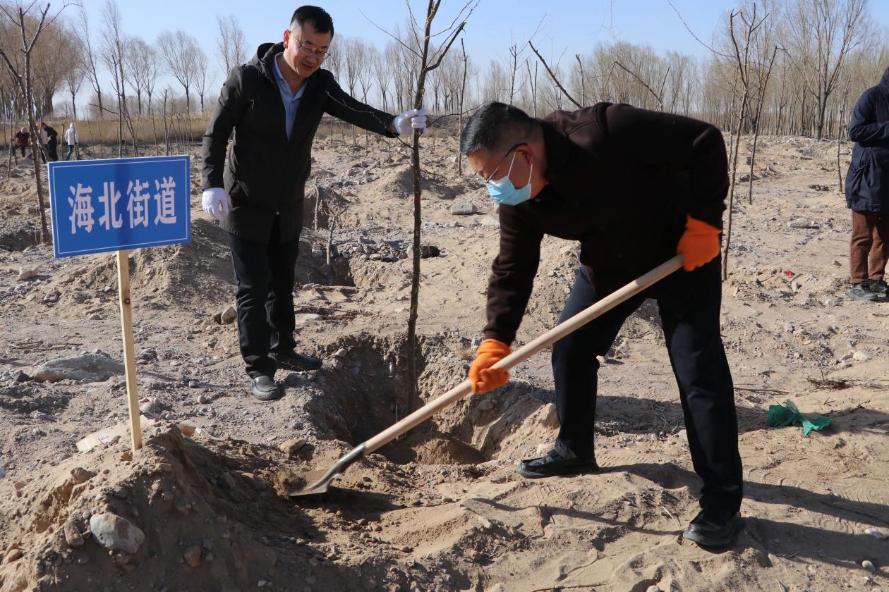 海勃湾区海北街道干部职工代表栽种沙枣树苗 (刘学颖 摄)