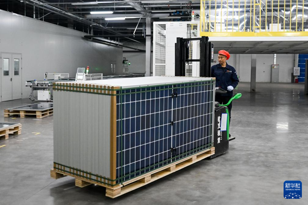 3月21日,在位于鄂尔多斯市的内蒙古亿利一道新能源有限公司,工人在搬运光伏组件。新华社记者 李志鹏 摄