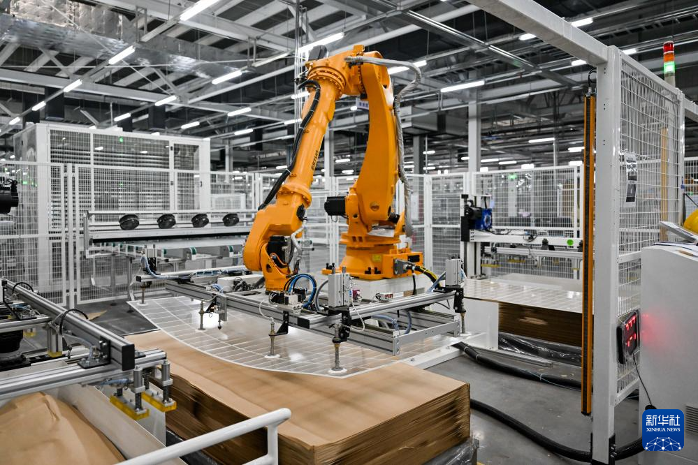 3月21日,在位于鄂尔多斯市的内蒙古亿利一道新能源有限公司,机械臂在光伏组件生产线上作业。新华社记者 李志鹏 摄