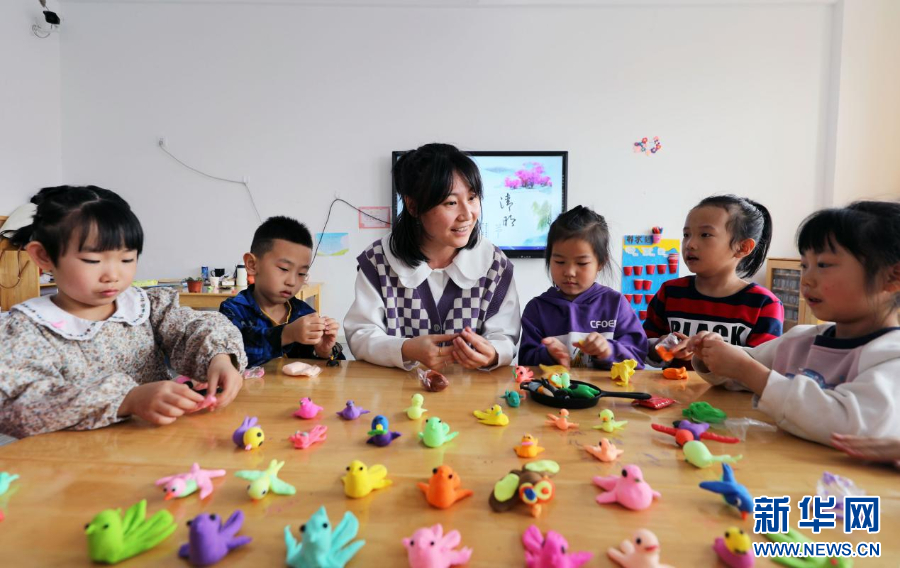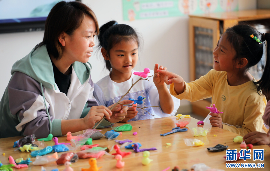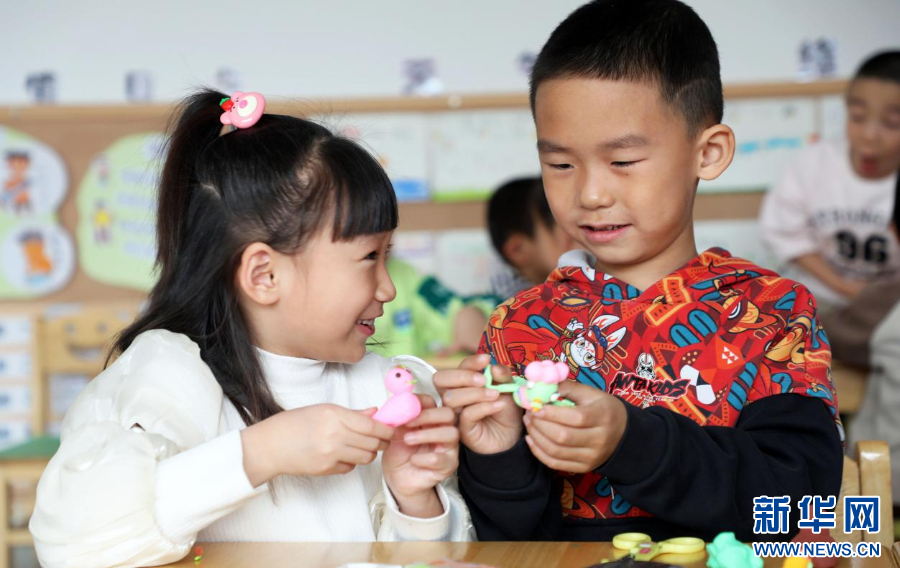 3月28日,内蒙古自治区呼伦贝尔市扎兰屯市成吉思汗镇中心幼儿园的小朋友在教师指导下做泥燕,寓意春燕归来。新华网发(韩冷 摄)