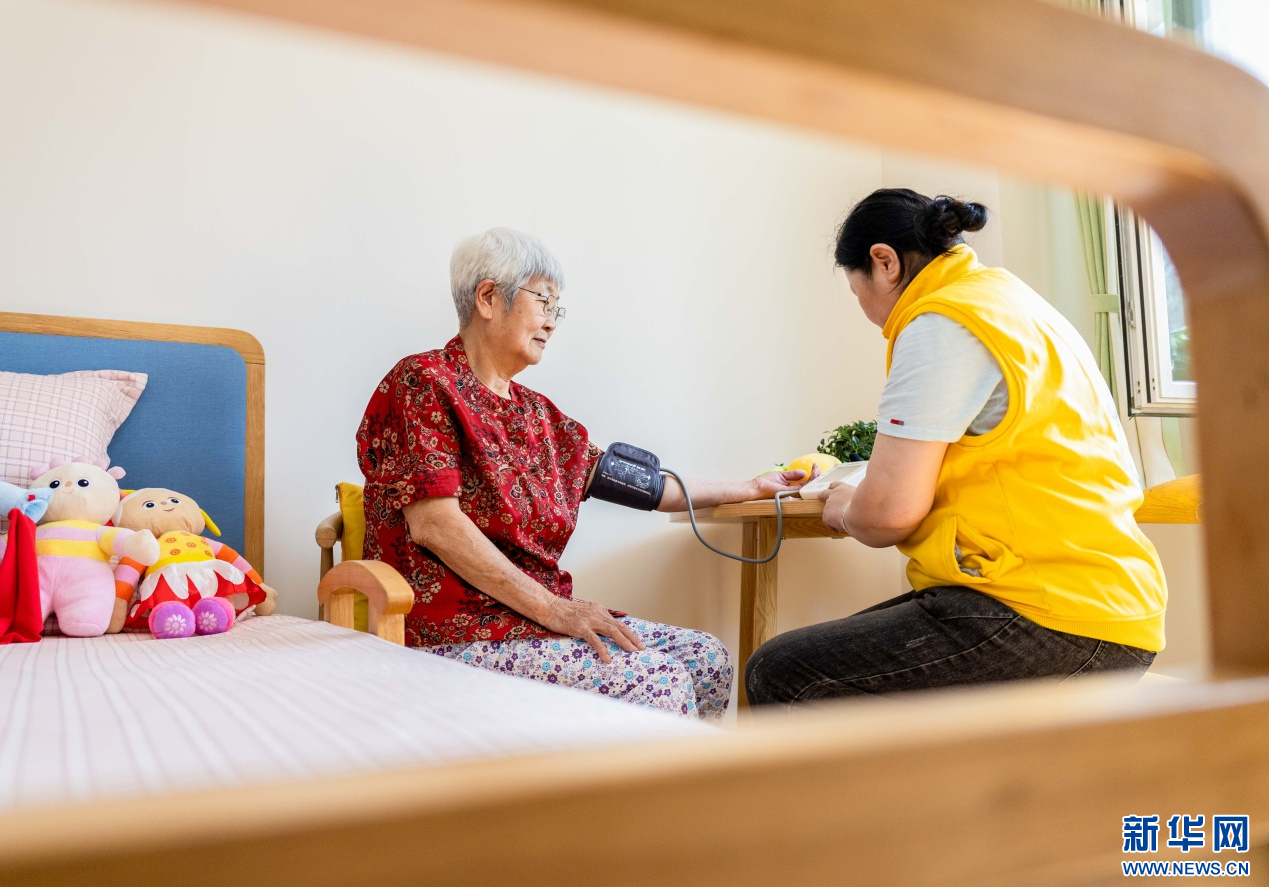 4月8日,工作人员在呼和浩特市玉泉区居家社区养老服务标准化示范中心为老人量血压。新华网发(丁根厚 摄)