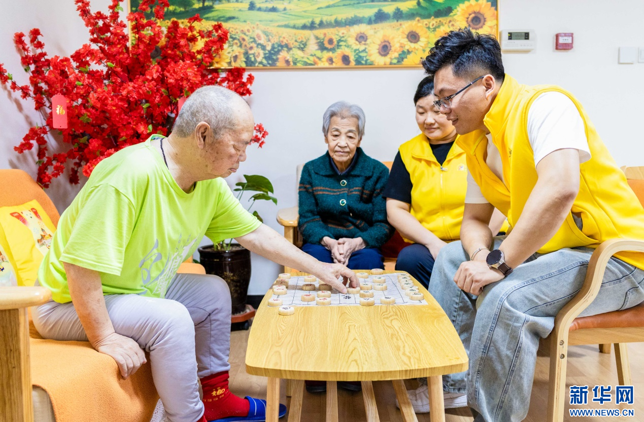 4月8日,工作人员在呼和浩特市玉泉区居家社区养老服务标准化示范中心陪老人下象棋。新华网发(丁根厚 摄)