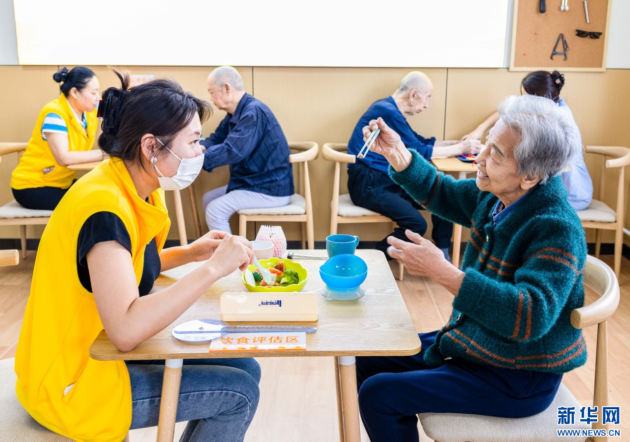 4月8日,老人在呼和浩特市玉泉区居家社区养老服务标准化示范中心“为老餐厅”内用餐。新华网发(丁根厚 摄)