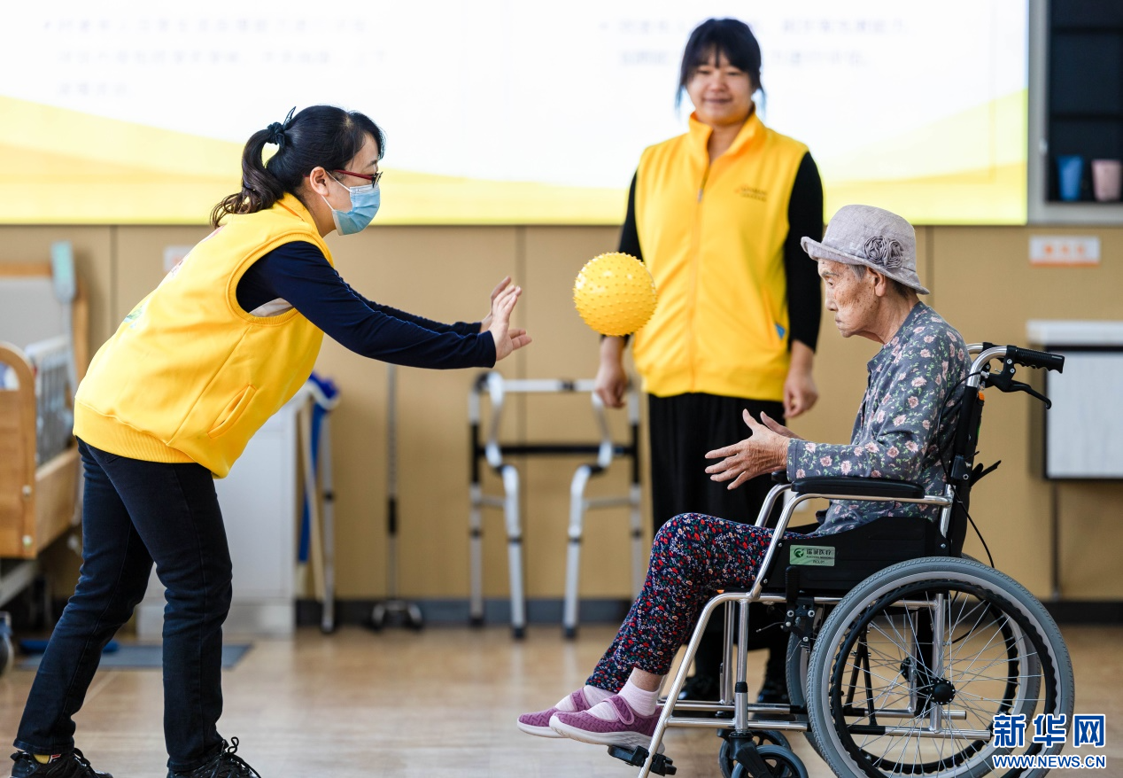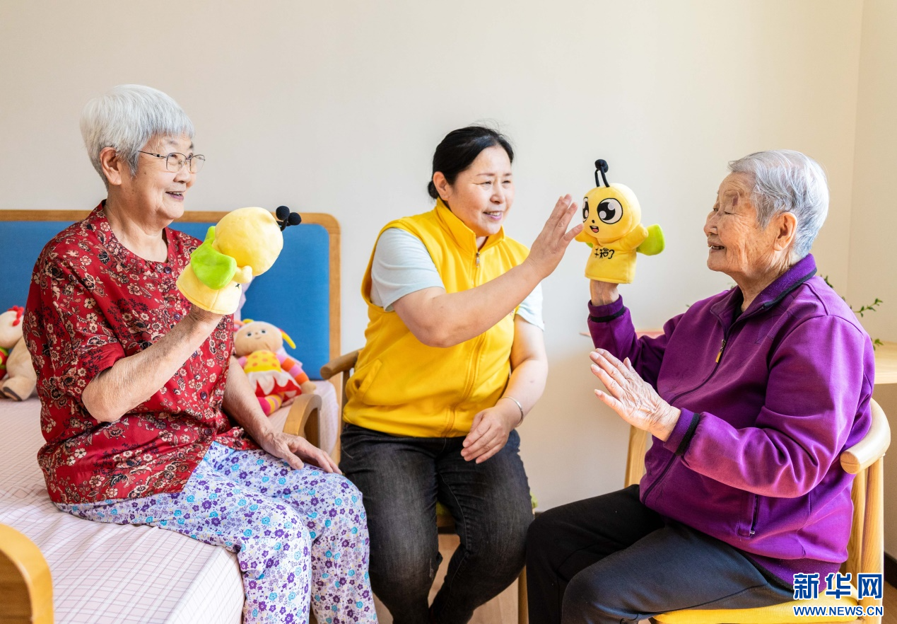 4月8日,工作人员在呼和浩特市玉泉区居家社区养老服务标准化示范中心与老人一起玩趣味游戏。新华网发(丁根厚 摄)