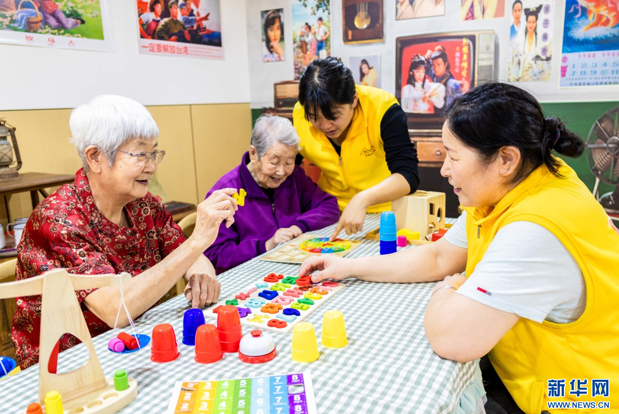 4月8日,工作人员在呼和浩特市玉泉区居家社区养老服务标准化示范中心陪老人做游戏。新华网发(丁根厚 摄)
