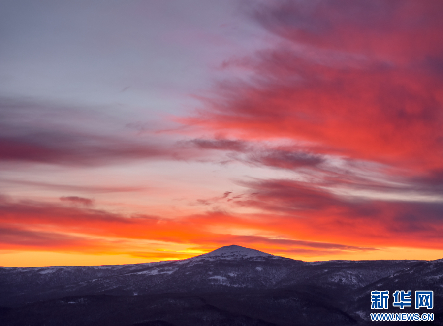 清晨太阳从东方冉冉升起,天空被朝霞渲染得绚丽多彩,奥克里堆山顶云雾缭绕,与朝霞作配,宛如一幅山水画铺展开来。新华网发 (吴少卿 摄)