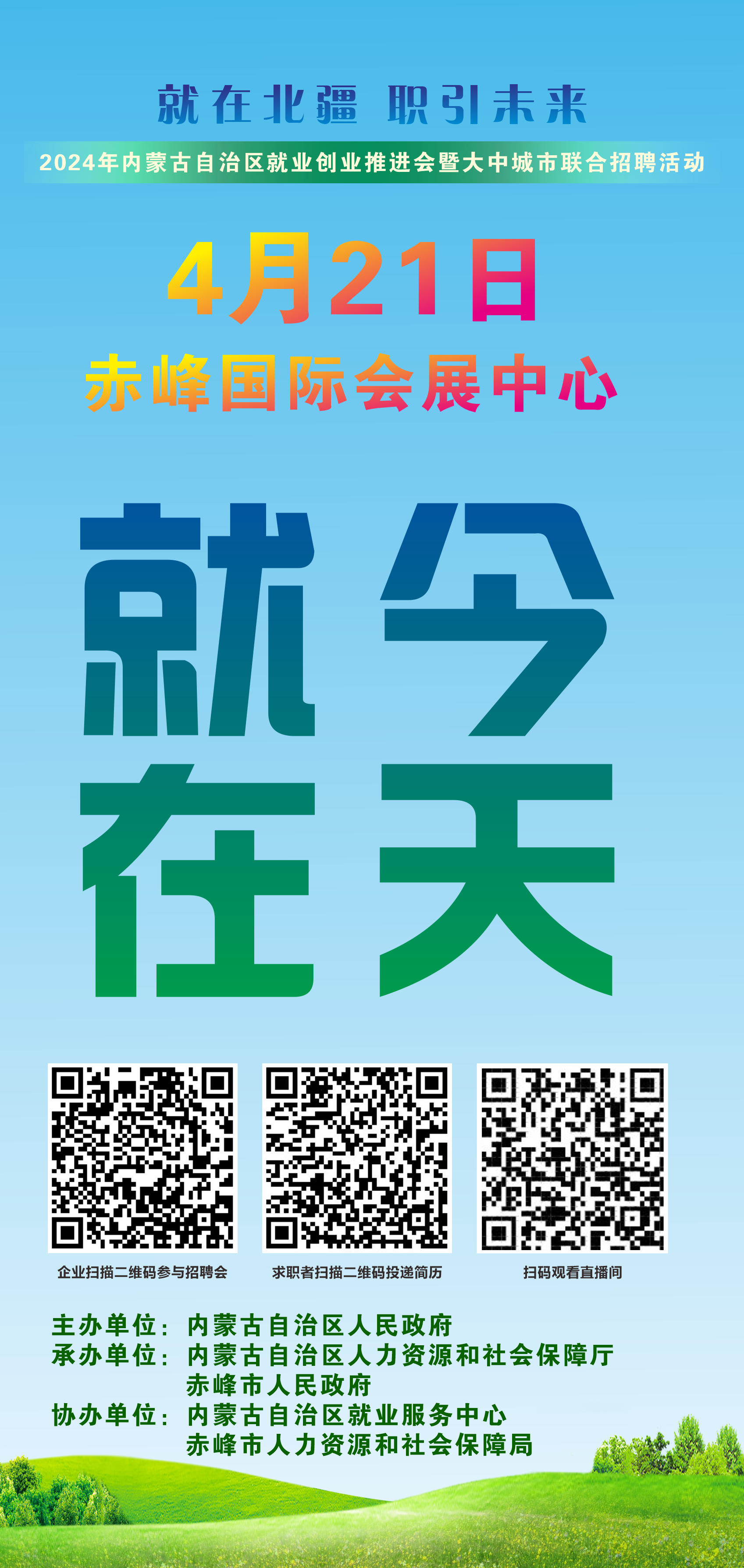 由内蒙古自治区人民政府主办的,2024年全区就业创业推进会暨大中城市联合招聘活动将在4月21日举行。活动主题为“就在北疆职引未来”,自治区主会场设在赤峰市会展中心,各盟市、计划单列市设分会场,21日当天同步启动并开展相关活动。