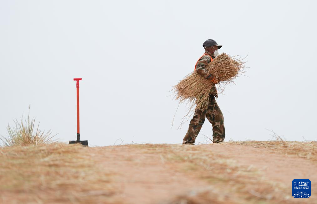 4月27日,治沙工人用稻草在沙漠中扎草方格。
