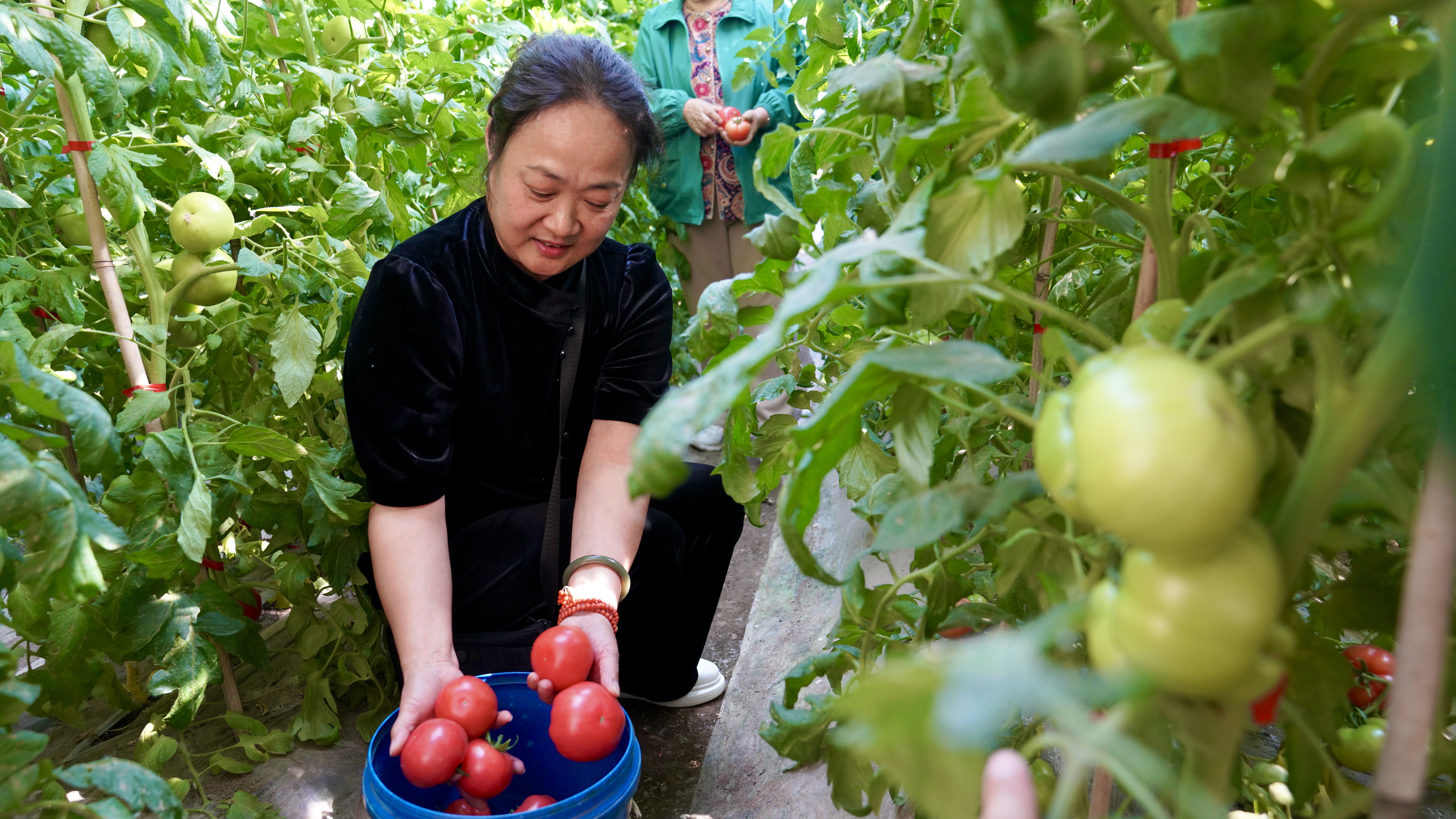 游客正在采摘包头市东河区沙尔沁镇大棚里的“普罗旺斯”西红柿。新华网发(吕必得摄)