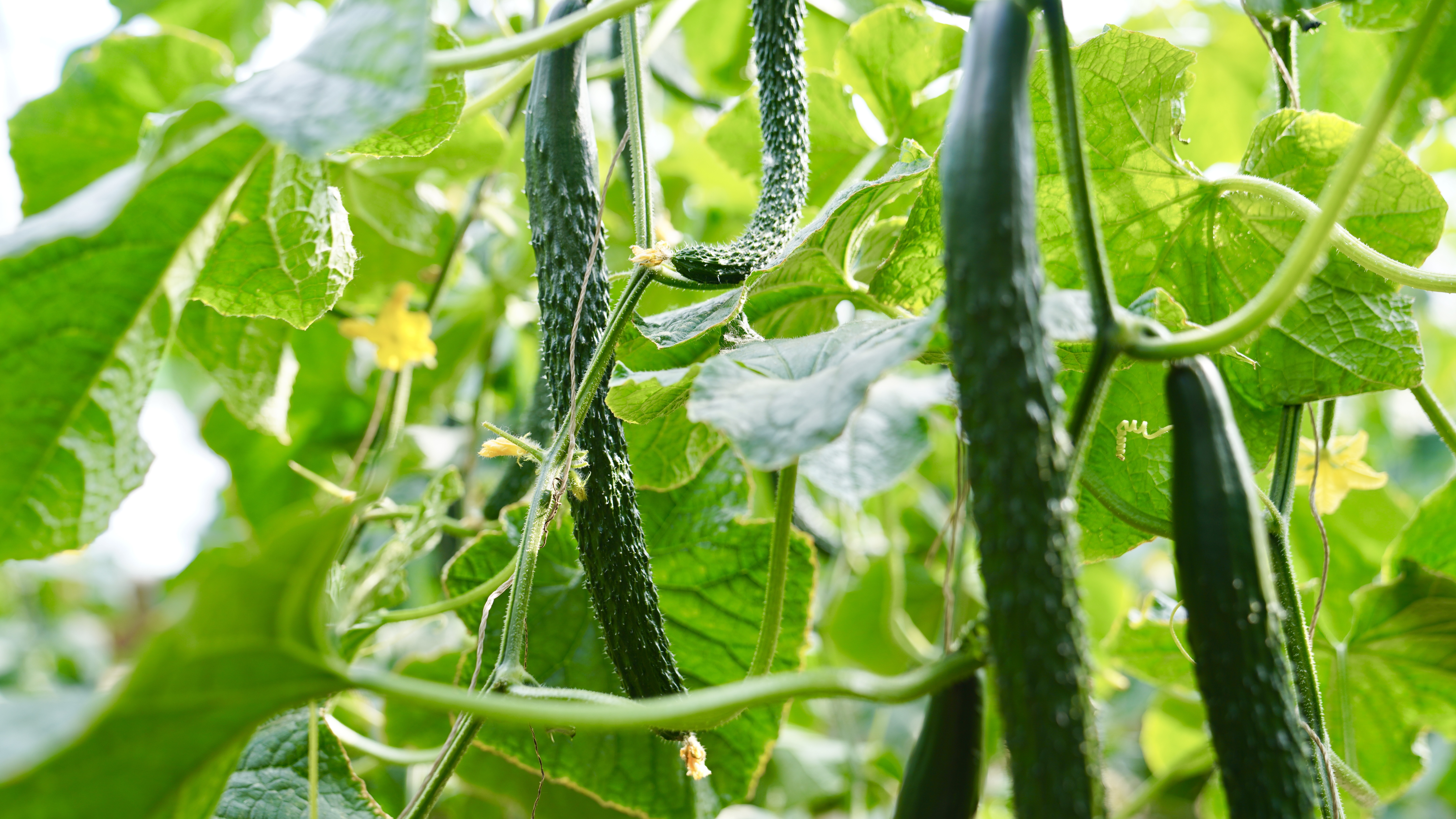 包头市东河区沙尔沁镇大棚里的黄瓜长势正旺。新华网发(吕必得摄)