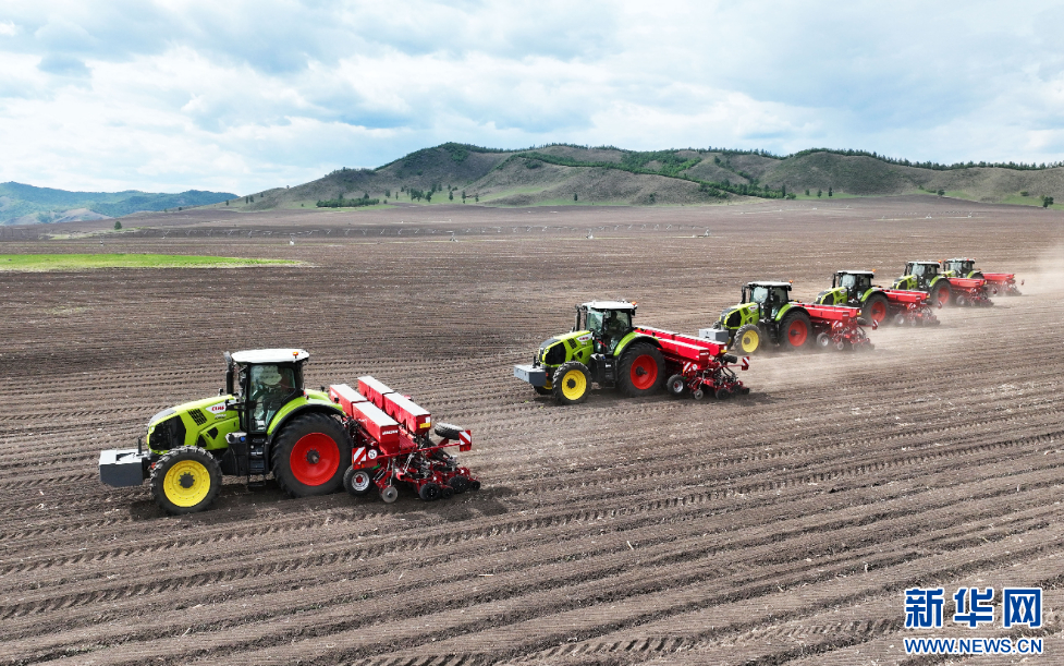 5月27日,联合播种机在内蒙古自治区呼伦贝尔农垦绰尔河农牧场有限公司田间播种大豆。新华网发(韩冷 摄)