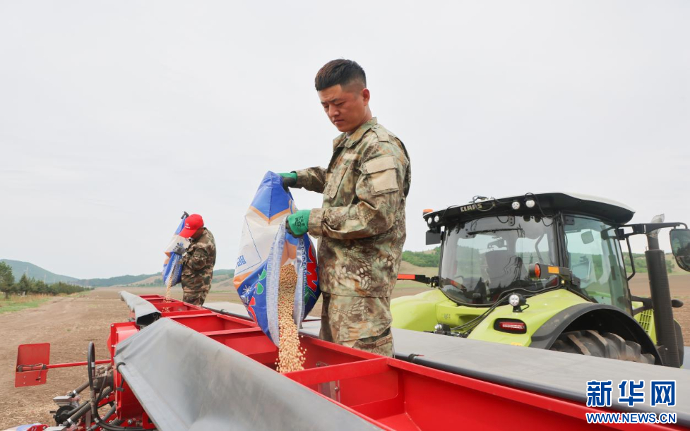 5月27日,工人在内蒙古自治区呼伦贝尔农垦绰尔河农牧场有限公司田间为播种机添加大豆种子。新华网发(董元权 摄)