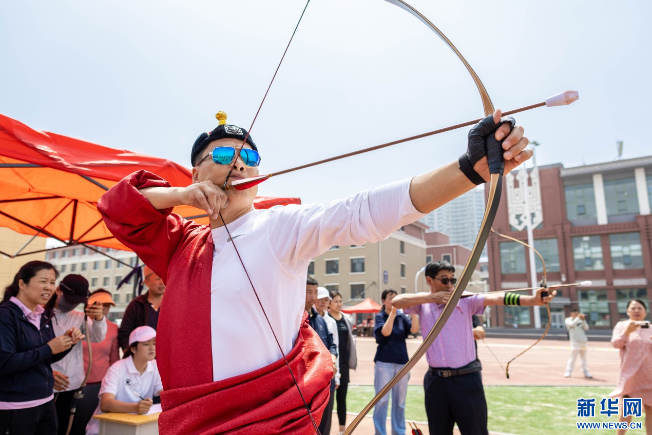 5月30日,呼和浩特民族学院教师在那达慕文化节上参加射箭比赛。新华网发(丁根厚 摄)