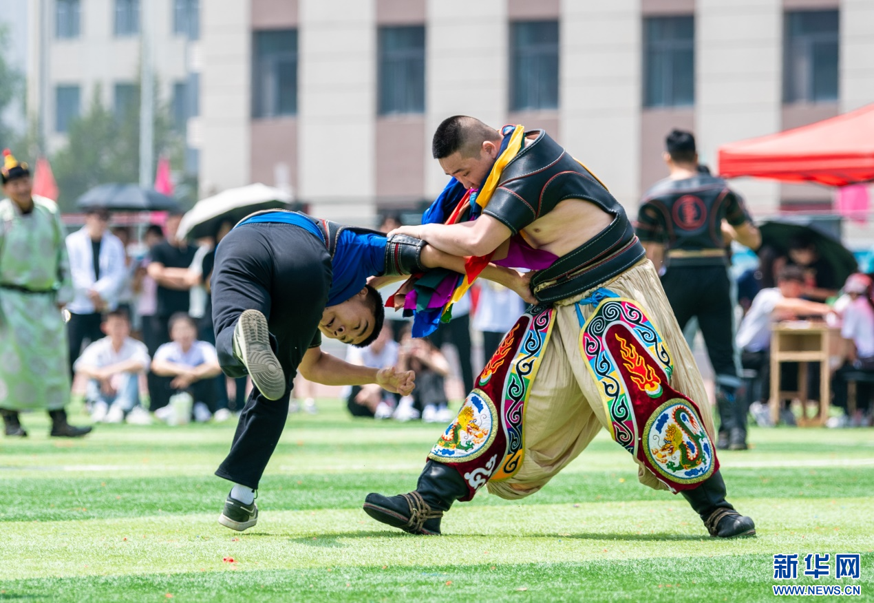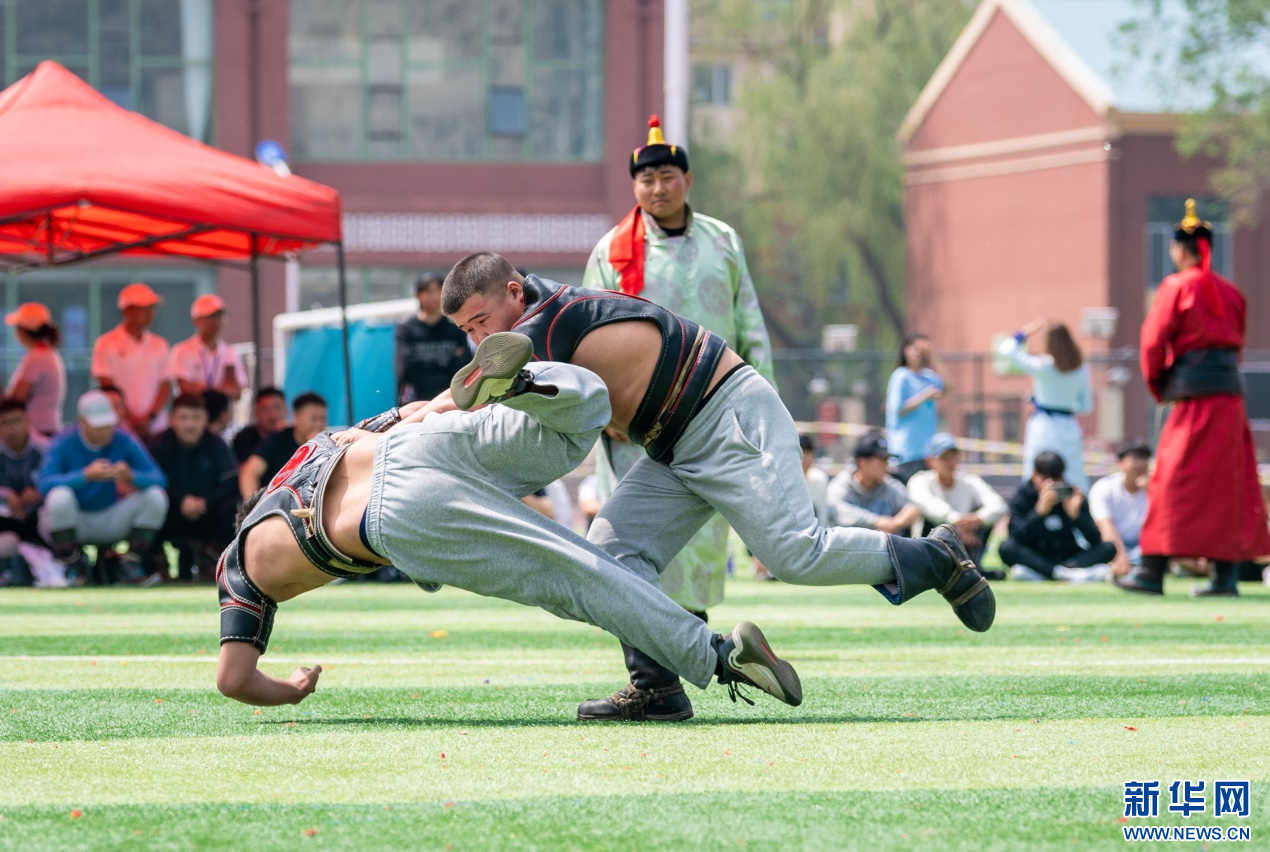 5月30日,呼和浩特民族学院学生在那达慕文化节上参加搏克比赛。新华网发(丁根厚 摄)