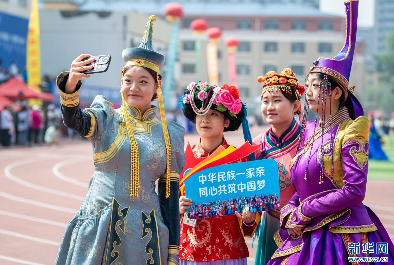 5月30日,呼和浩特民族学院学生在那达慕文化节开幕式上自拍留影。新华网发(丁根厚 摄)
