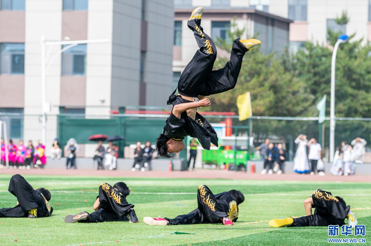 5月30日,呼和浩特民族学院学生在那达慕文化节开幕式上表演武术《舞动青春》。新华网发(丁根厚 摄)