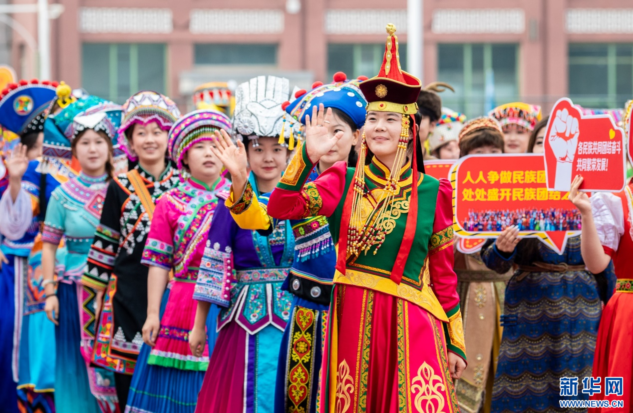 5月30日,呼和浩特民族学院石榴籽方队在那达慕文化节开幕式上亮相。新华网发(丁根厚 摄)
