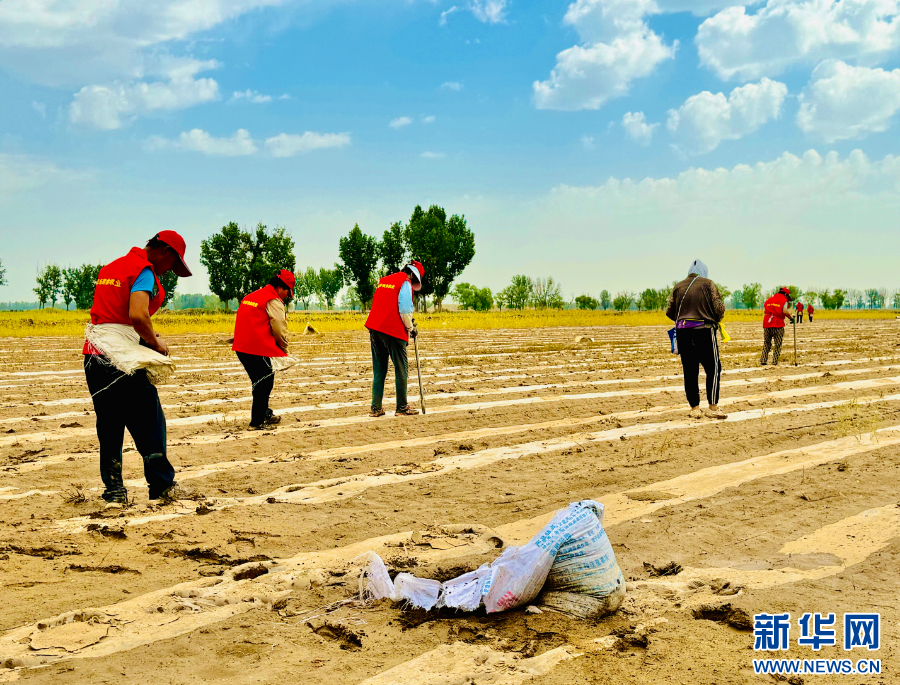 村民们正在集中播种向日葵。新华网发(杨鑫 摄)