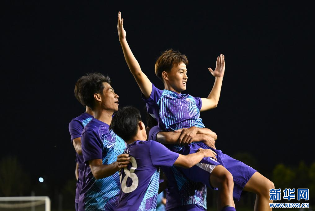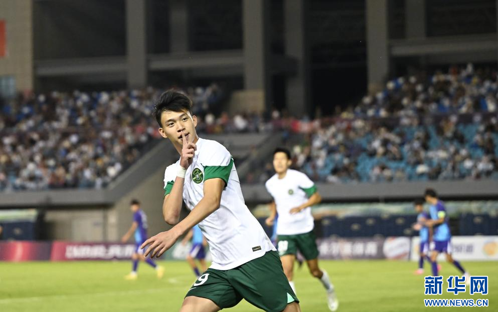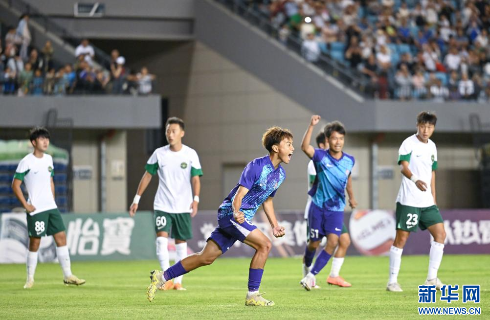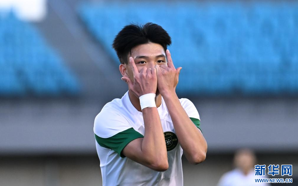 6月15日,浙江俱乐部U21队球员王钰栋在比赛中庆祝进球。
