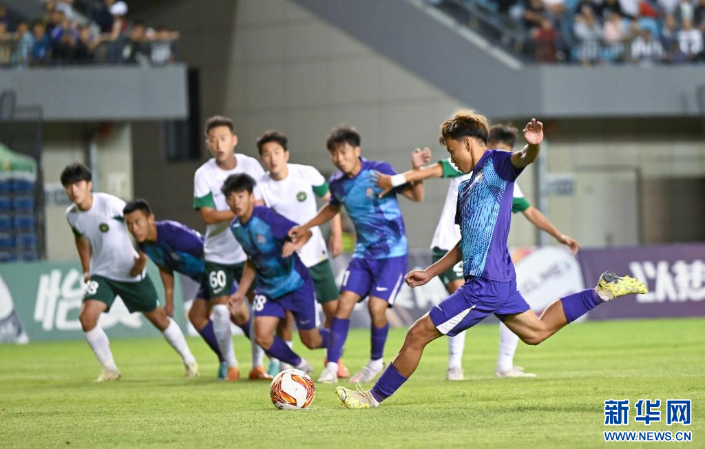 6月15日,浙江俱乐部U21队球员王钰栋(前右)在比赛中主罚点球得分。