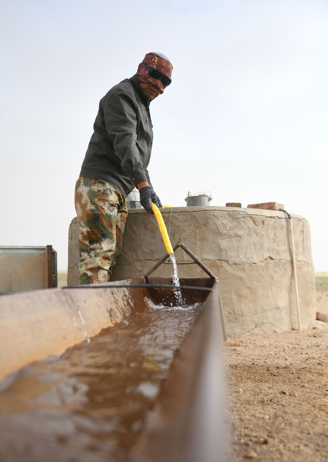 四子王旗牧民乌力吉正在给牛羊饮水。