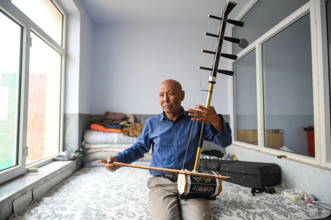 四子王旗牧民吉日嘎拉在家拉四胡。