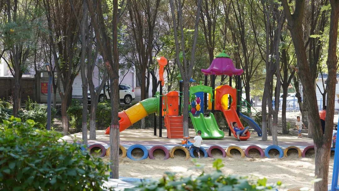温馨家园小区外围修建了口袋公园,园内绿树荫荫,既有健身器材,也有儿童玩耍的沙池等,方便居民日常休闲娱乐。