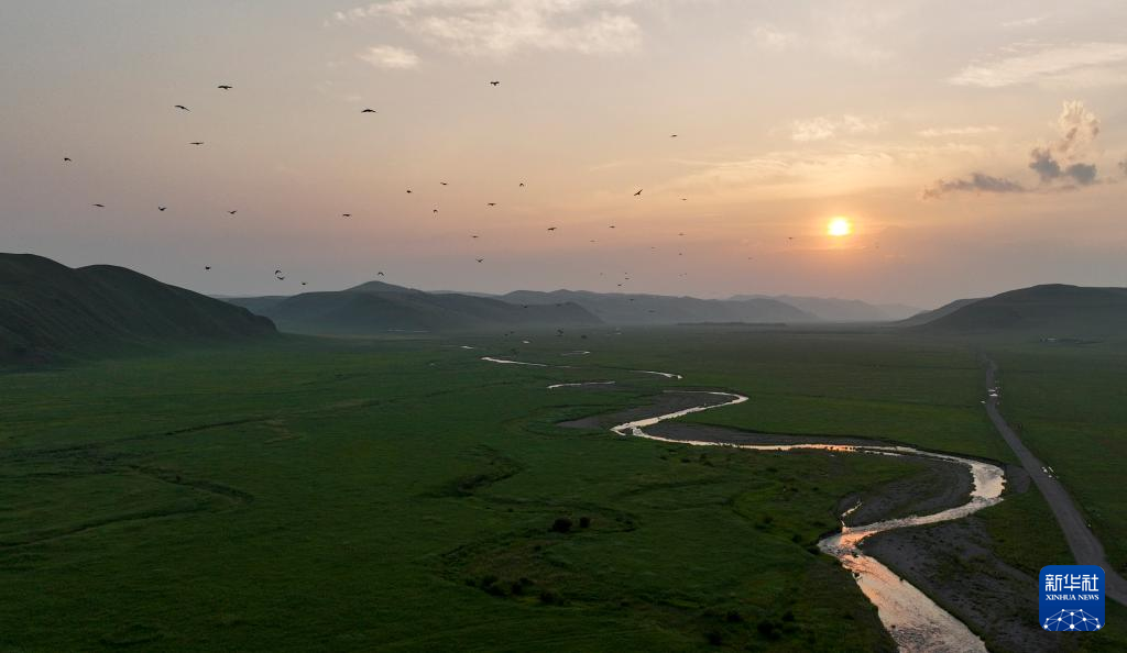 7月18日拍摄的乌兰毛都草原日落景色(无人机照片)。