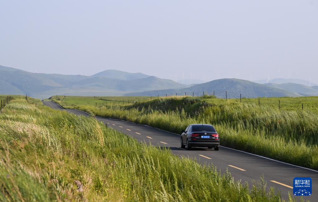 7月18日,车辆行驶在乌兰毛都草原中的公路上。