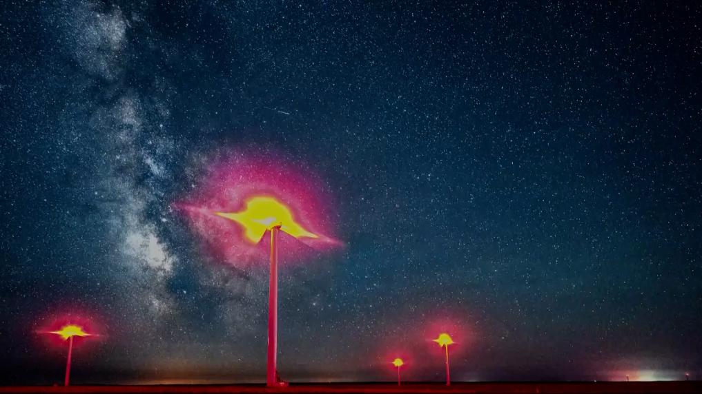 眼下,每当夜幕降临,在内蒙古乌拉特中旗草原风力发电场,转动的大风车与浩瀚的星空交相辉映,体现科技智慧与自然力量的完美融合,展现出独有的美丽与浪漫,共同构成一幅壮丽画卷。