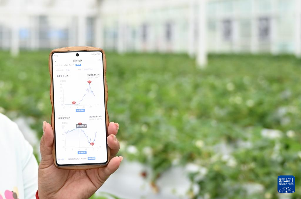 9月4日,技术管理人员在智能玻璃温室中展示手机上显示的大棚内实时温湿度。
