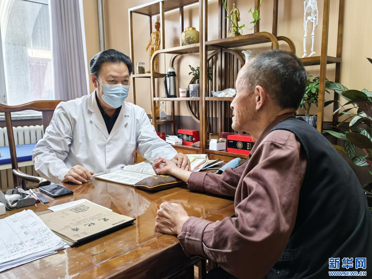 9月11日,乌兰察布市集宁区桥西街道综合养老服务中心中医门诊大夫为前来就医的居民把脉。新华网郝芳芳 摄