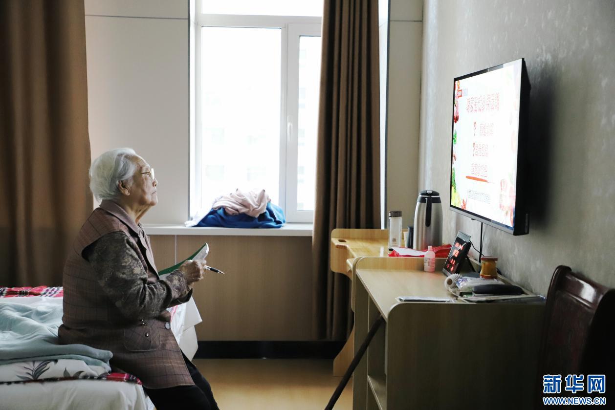 9月11日,一位老人在乌兰察布市集宁区泉山街道为老惠民医养综合体养老公寓房间内观看电视节目。新华网发(张林虎 摄)